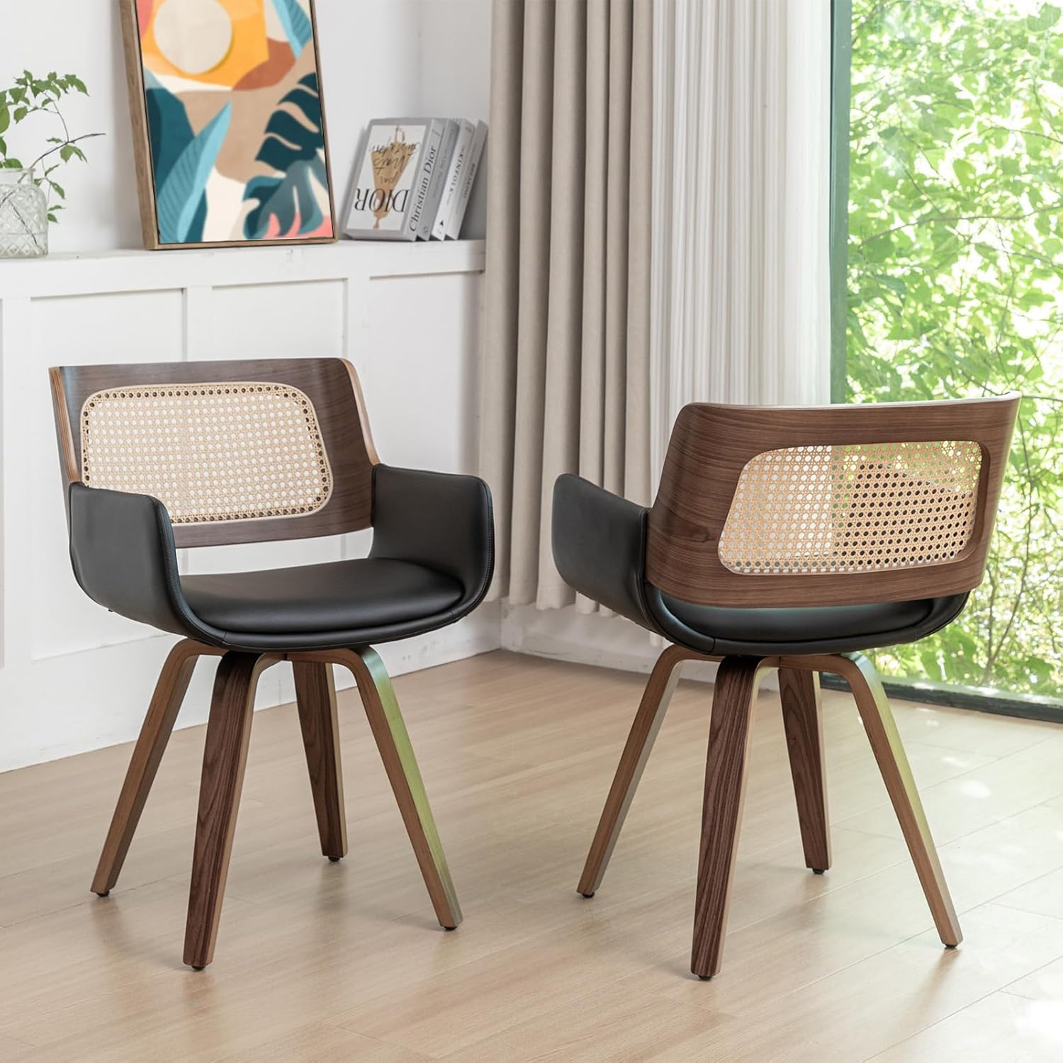 Enjoy a mix of style and comfort with our swivel cane back dining chairs, an ideal combination of Mid-Century, Modernism, Bohemian, and Retro styles. Perfect for upgrading your dining room, living room, kitchen, or reception area, these swivel dining chairs easily match any decor, proving to be a flexible choice for your space.