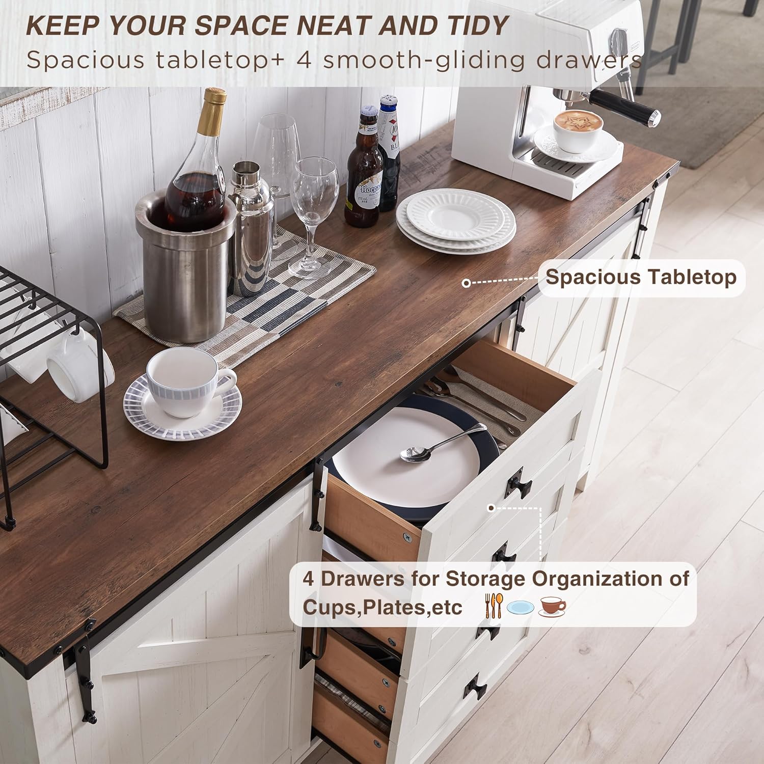 Roomy tabletop for your coffee bar, cups, drinks etc