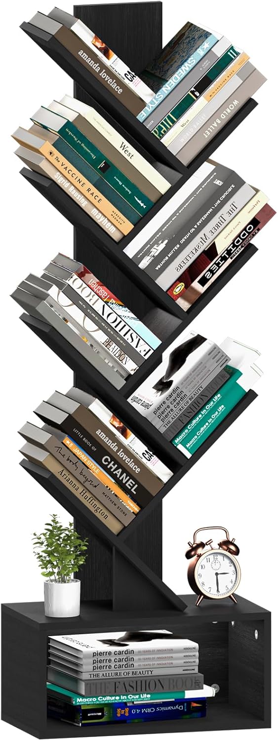 Yoobure Tree Bookshelf – 6 Shelf Retro Floor Standing Bookcase, Tall Wood Book Storage Rack for CDs/Movies/Books, Utility Book Organizer Shelves for Bedroom, Living Room, Home Office, Rustic Brown